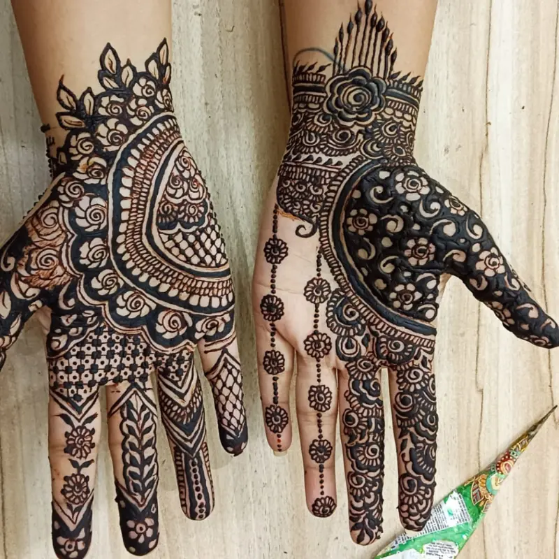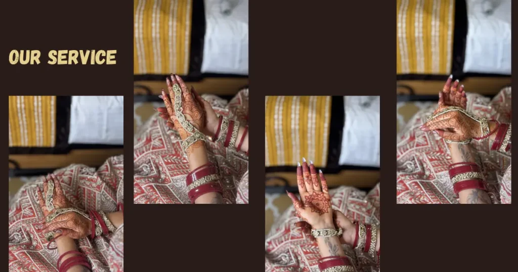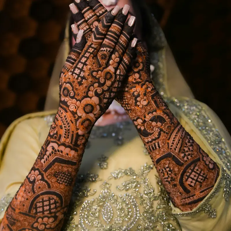 Bridal mehendi is not just a design but a tradition that carries many emotions and beauty . At Kulsum Henna studio , we design elaborate bridal mehendi for your wedding look .